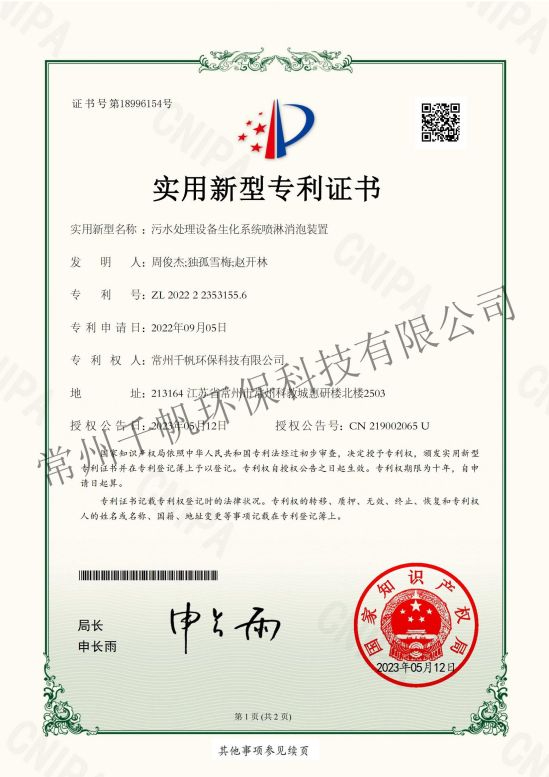 實用新型專利證書 污水處理設(shè)備生化系統(tǒng)噴淋消泡裝置